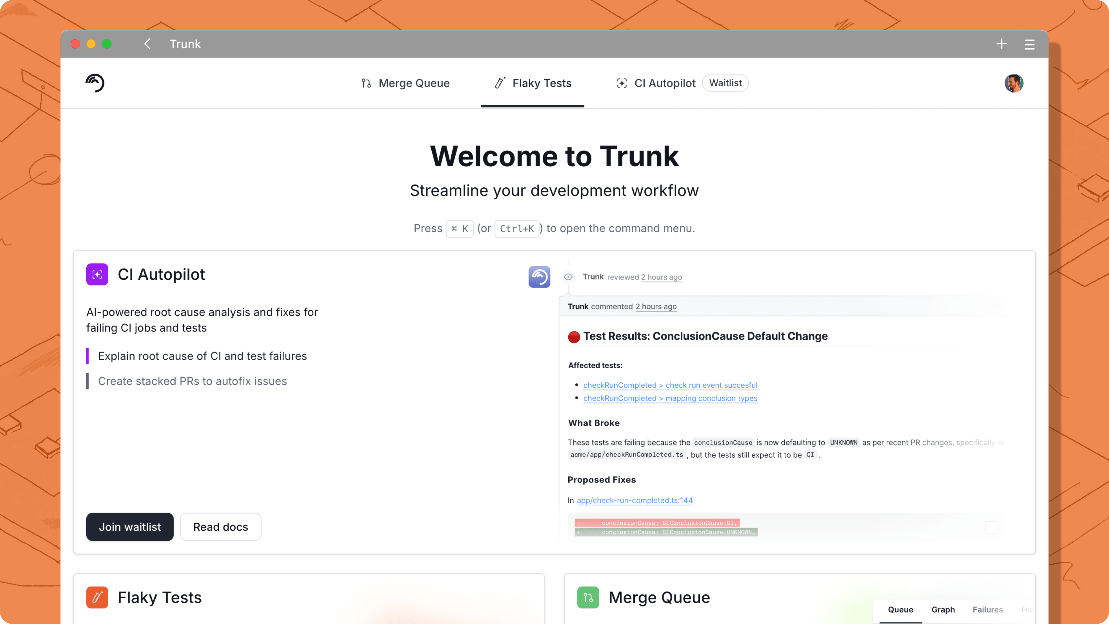 We can’t wait to show you what’s next. You can follow our progress by signing up for our in-app waitlist. If you have questions or concerns, please reach out via email (support@trunk.io) or Slack.