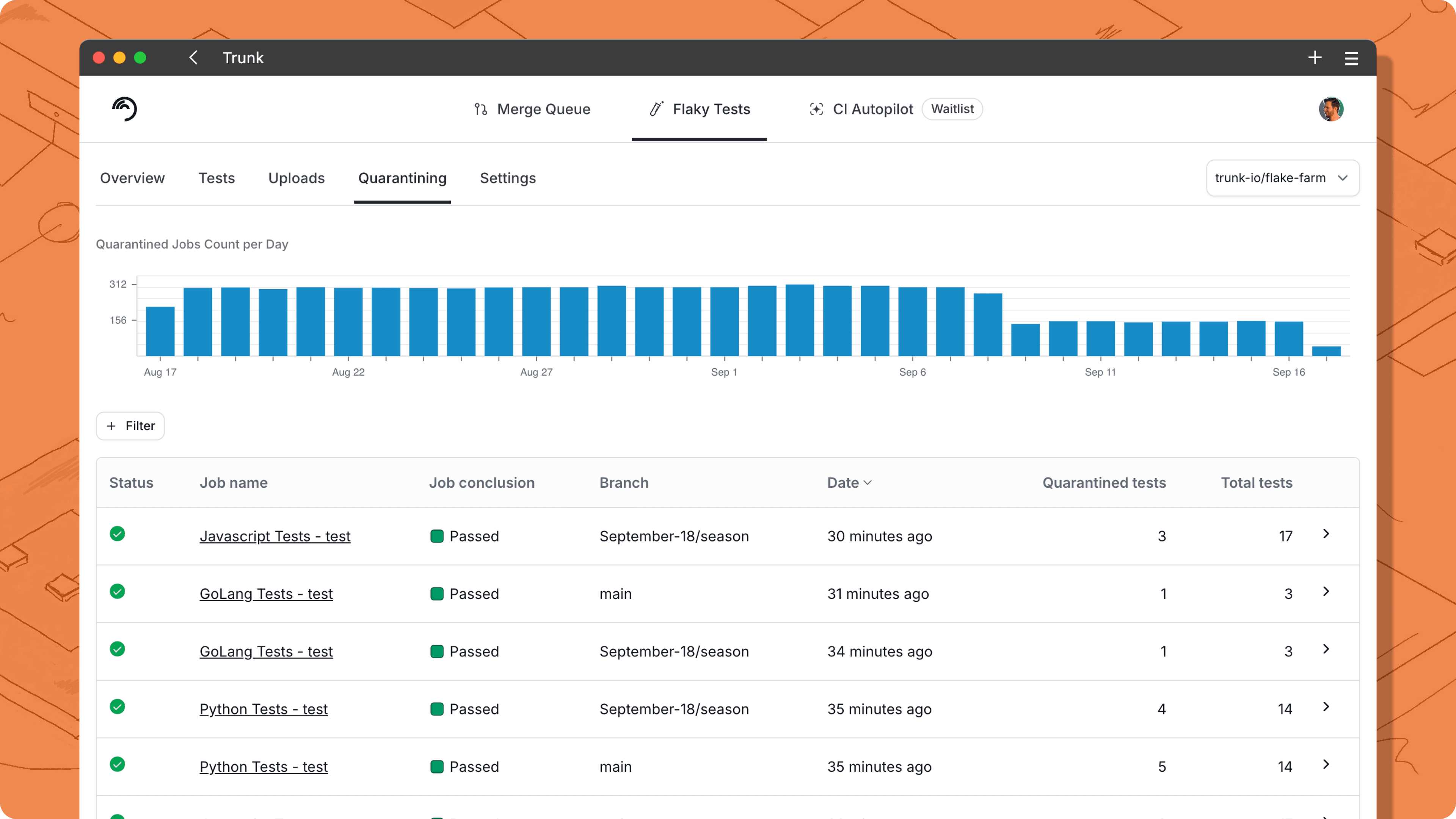 The last step is integrating with your CI provider. After integrating, Trunk will automatically detect and quarantine your flaky tests every time the CI job runs.