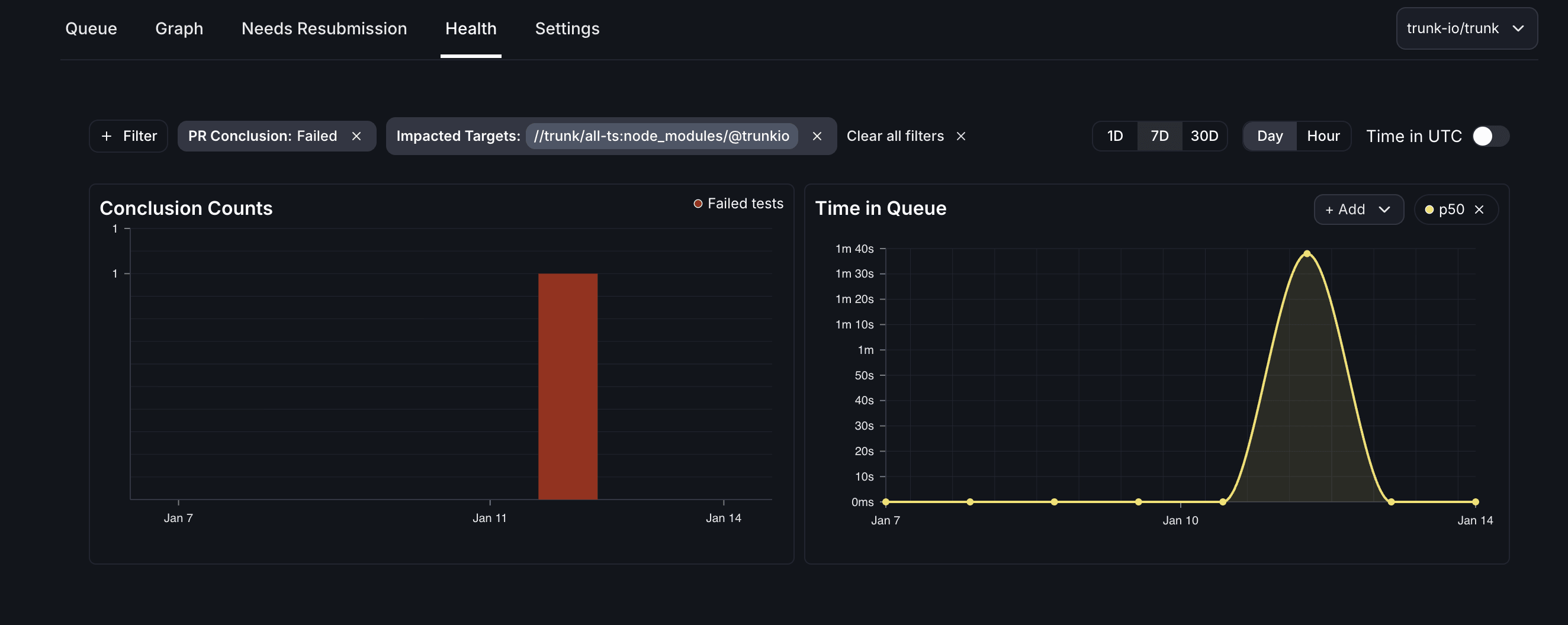 Now you can filter merge queue health metrics by impacted targets to see exactly how well this parallel workflow is performing for each part of your codebase. For example, in a TypeScript/Python monorepo, you can view metrics specifically for TypeScript PRs versus Python PRs, identify if one team is experiencing slower merge times than another, and optimize queue configuration for your highest-priority code paths.