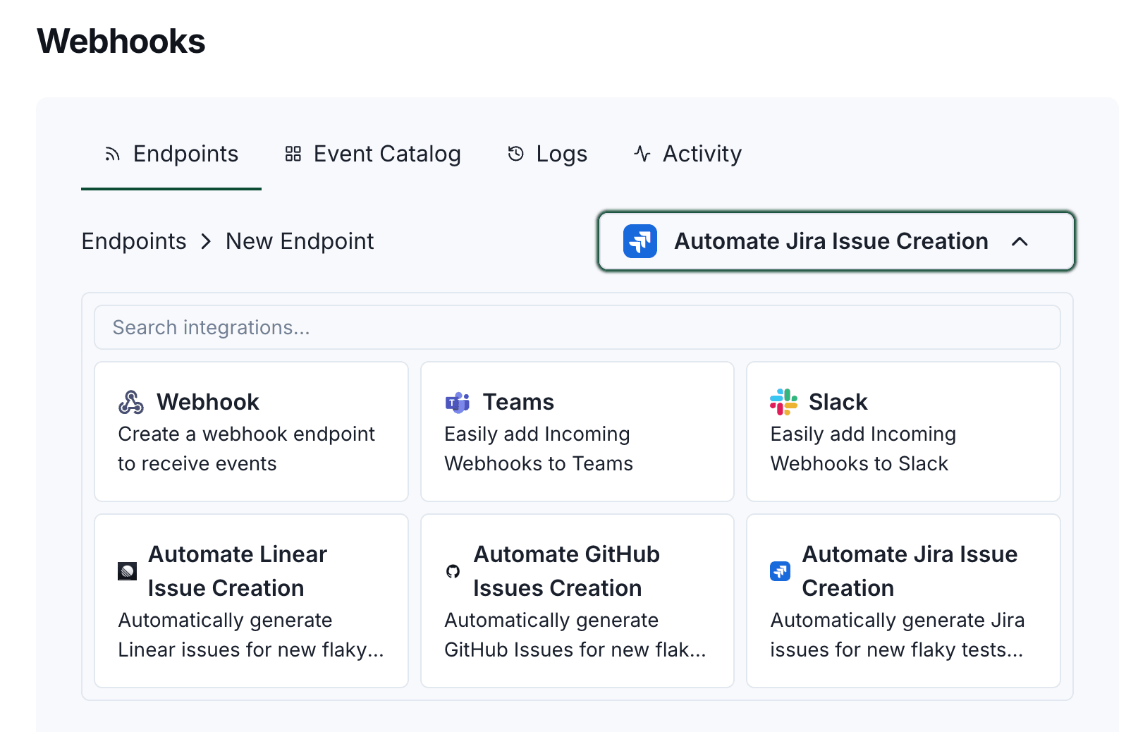 A new Jira connector in your webhook settings creates issues in your Jira Cloud project whenever a test's status changes to flaky and impacts more than a configurable number of PRs. This mirrors the existing Linear webhook integration. Configure your Jira project key, issue type, labels, and custom fields, and issues are created with full test context including failure rates, codeowners, and links back to the Trunk test detail page.