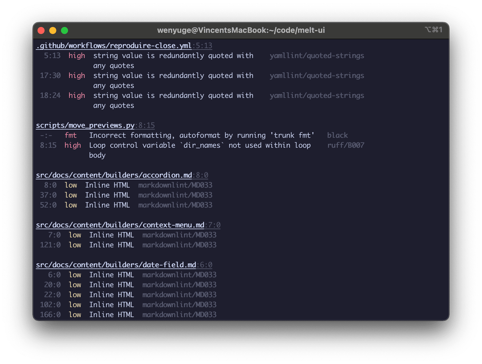 Trunk Code Quality also reformats the output of these tools to be consistent, unified, and organized by file, so it’s easier to read through the linting issues, even if there are many issues from different linters.