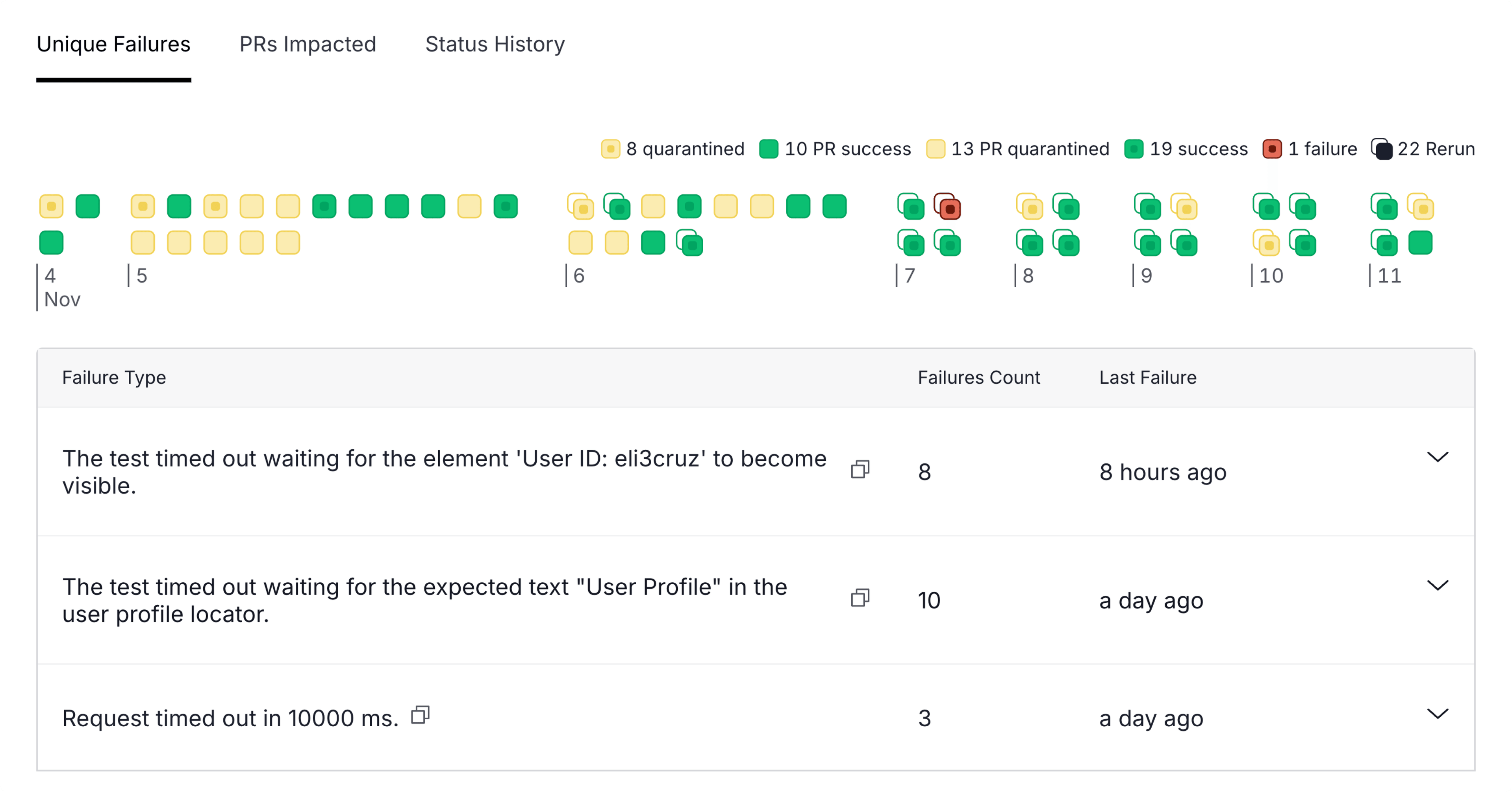 These screens don’t come from the requirements or feedback of a single customer, everyone has a different set of information that they intuitively believe to be important. Through the beta program, by pooling common feedback from different customers, we think these three different screens manage to condense the massive amount of information needed to understand flaky tests into a digestible format. It fits a variety of use cases and scales well even if you’ve got tens of thousands of tests.