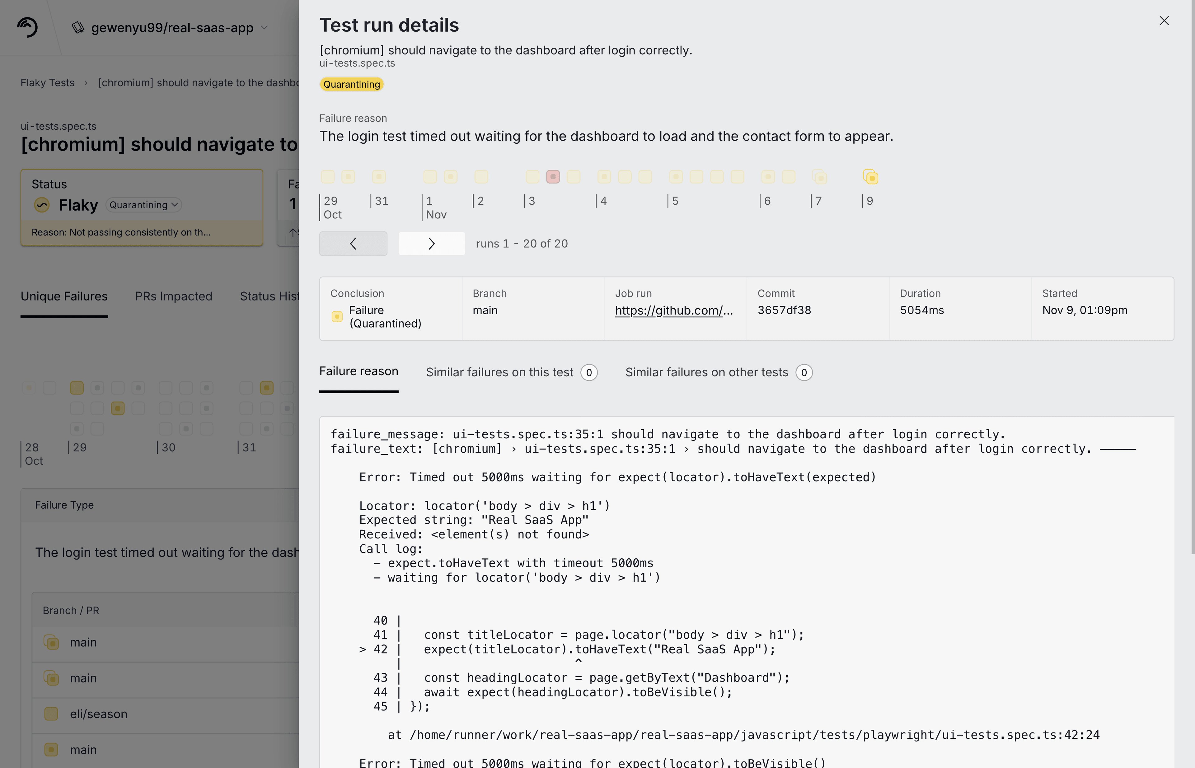 When you click on a single flaky test, it opens another screen that focuses on helping you debug an individual test. You’ll see a report of its results over the last seven days and the unique ways that the test has failed. You can see when the test started failing and on which branches. This helps you understand what might have caused the test to become flaky and how it fails when it’s flaky, and ultimately helps you debug the test.
