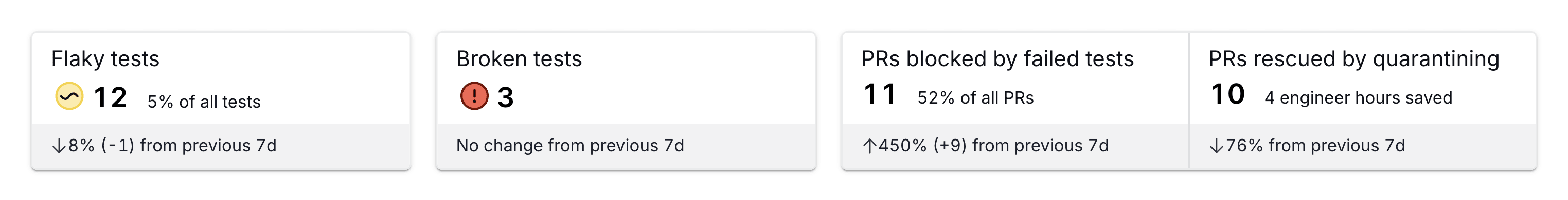 The first screen is the overview dashboard, which shows the overall health of your tests across many CI jobs. You’ll see how many tests are flaky and broken, and you’ll see time-series data on the trends in your repo. This view focuses on helping you understand the overall impact of flaky tests on your repo and finding the highest-impact tests to tackle next.