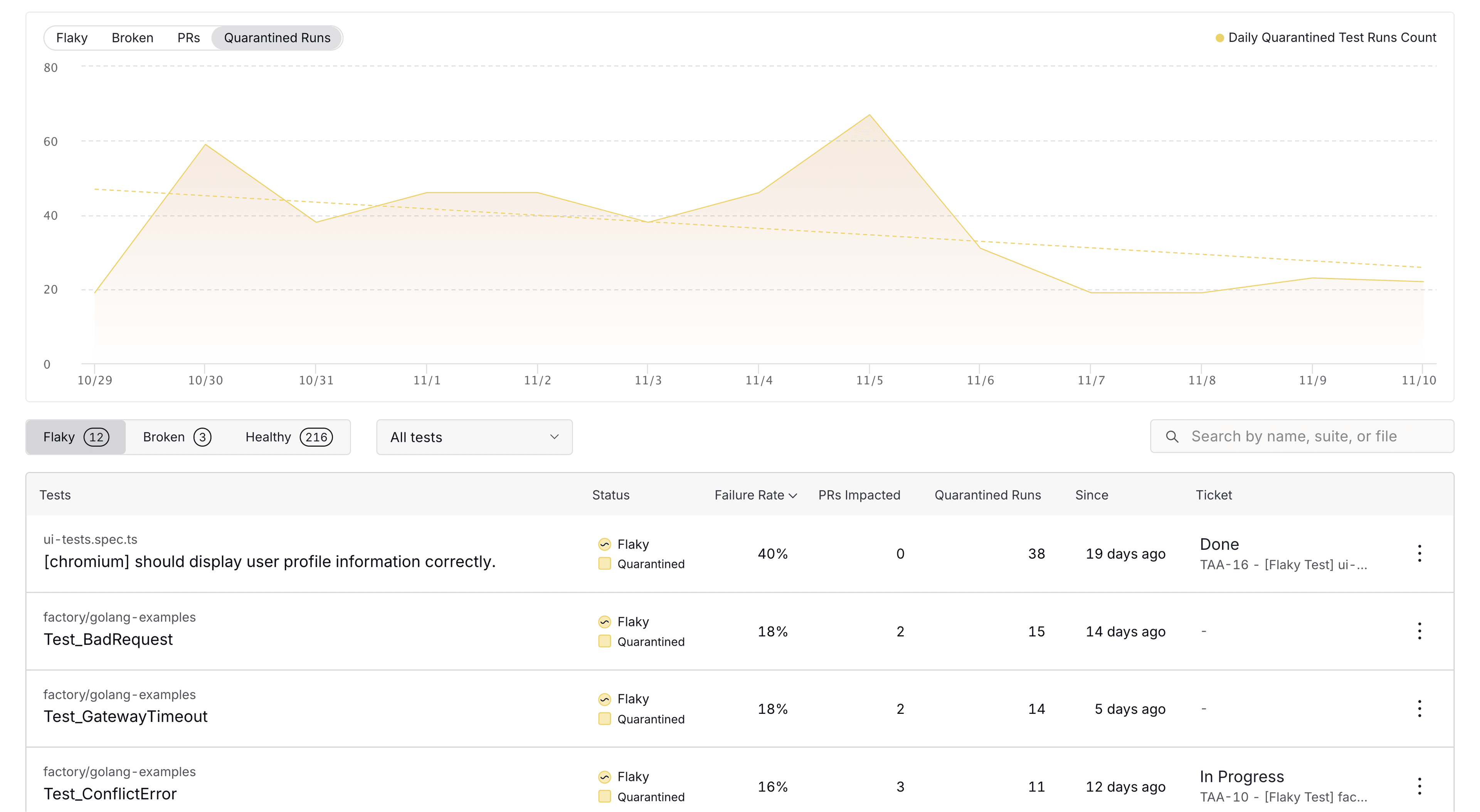 Another interesting challenge is displaying the thousands of tests, their results, their health status, whether they have an attached ticket/issue, and whether they’ve been quarantined. A lot of information needs to be displayed differently if you’re a team lead keeping track of overall test health or a contributor debugging flaky tests on a PR. After revisions with our beta partners, we landed on three key views for different workflows.