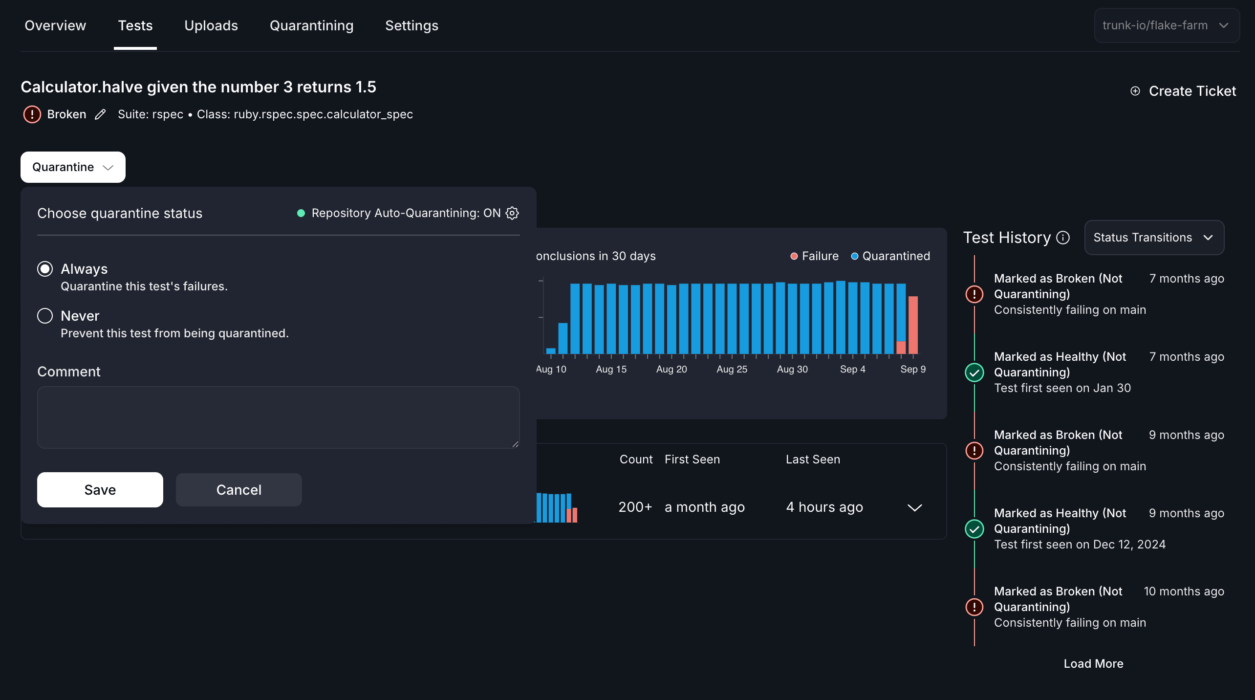 This allows you to build automations and custom workflows when a test’s quarantine setting is changed, such as automatically creating Linear or Jira tickets to fix flaky or broken tests marked as ALWAYS_QUARANTINED, or sending a message to the team in Slack so everyone is kept up to date on status changes.